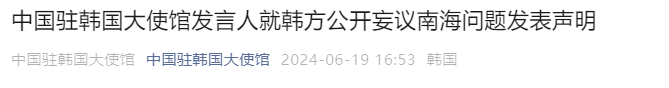 據中國駐韓國大使館微信公眾號19日消息,中國駐韓國大使館發言人就韓方公開妄議南海問題發表聲明。