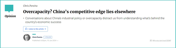 6月10日,彭家榮在《南華早報》撰文分析,”產能過剩“本質上是美國市場競爭力落後於中國的另類敍事。
