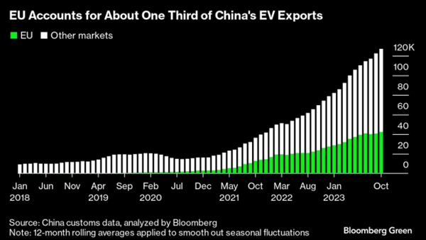 歐盟大約佔據了中國新能源汽車出口三分之一的份額 圖自彭博社