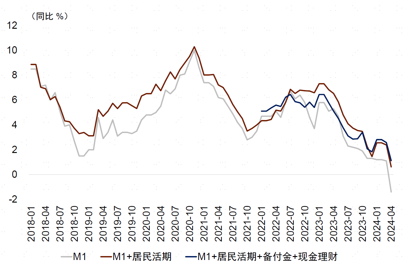 據央行主管媒體《金融時報》此前分析,2024年4月末,人民銀行公佈的M1規模為 66.0萬億元,同比下降了1.4%。如果將個人活期存款加入到M1統計當中,則4月末規模為104.8萬億元,同比增長了0.6%(基數同步調整,後同)。如果再將支付公司客户備付金、貨幣基金以及現金類理財產品也納入到M1中,則4月末規模為129.1萬億元,同比增長了2.6%。整體來看,納入上述三類資金後的M1增速雖然也在下行,但整體上波動幅度明顯降低。