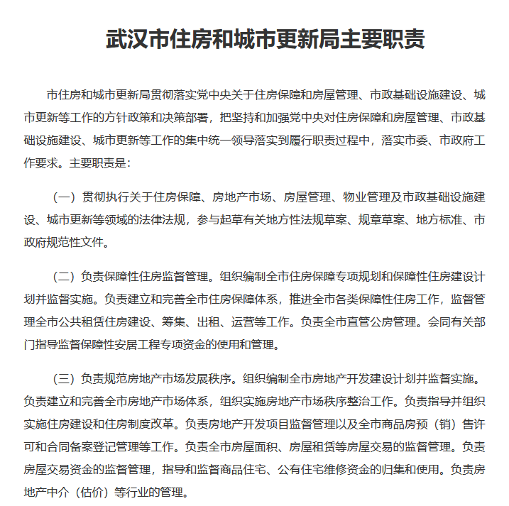 以武漢市住房和城市更新局主要職責為例,該局官網介紹道,市住房和城市更新局貫徹落實黨中央關於住房保障和房屋管理、市政基礎設施建設、城市更新等工作的方針政策和決策部署,把堅持和加強黨中央對住房保障和房屋管理、市政基礎設施建設、城市更新等工作的集中統一領導落實到履行職責過程中,落實市委、市政府工作要求。