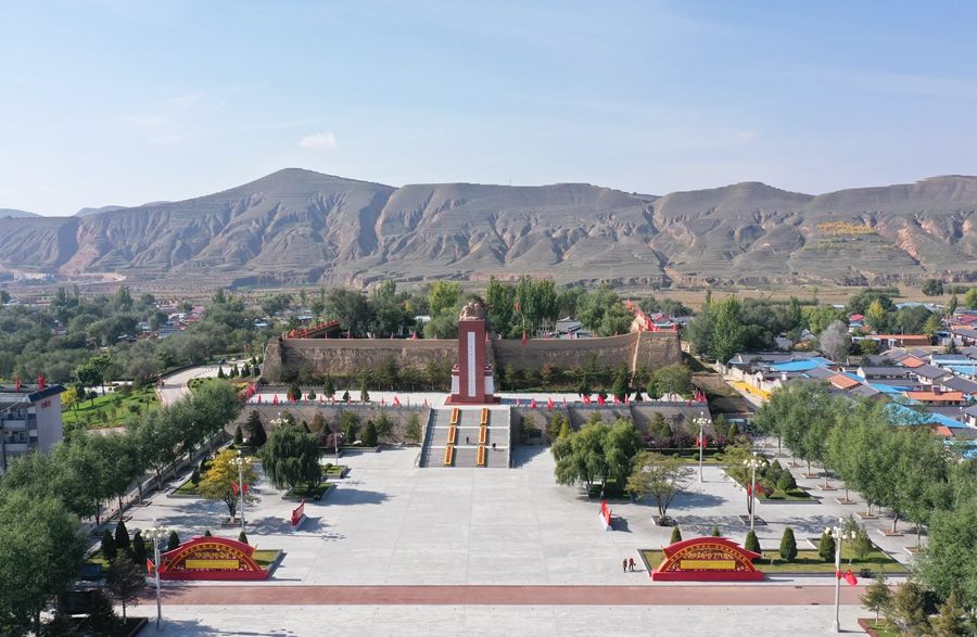 這是位於寧夏固原市西吉縣的將台堡紅軍長征會師紀念園(2021年10月18日攝,無人機照片)。新華社記者 盧鷹 攝