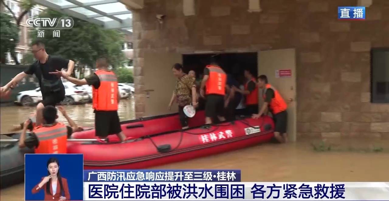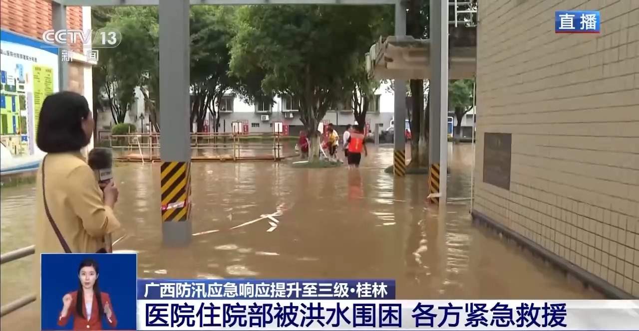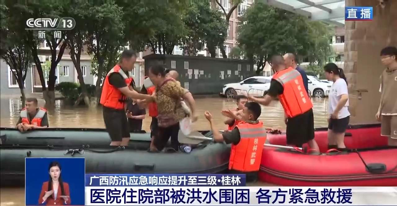近期廣西降雨持續、超警河流多、洪水量級較大。今天11時,廣西仍有潯江、西江、黔江、桂江、賀江、柳江及鬱江等22條河流37個站出現超警0.07~5.25米的洪水。國家防總也於昨天將廣西防汛應急響應提升至三級。受降雨影響,桂林城區多地發生嚴重內澇。其中,南溪山醫院住院部一樓積水較深,武警官兵正在現場緊急救援中。