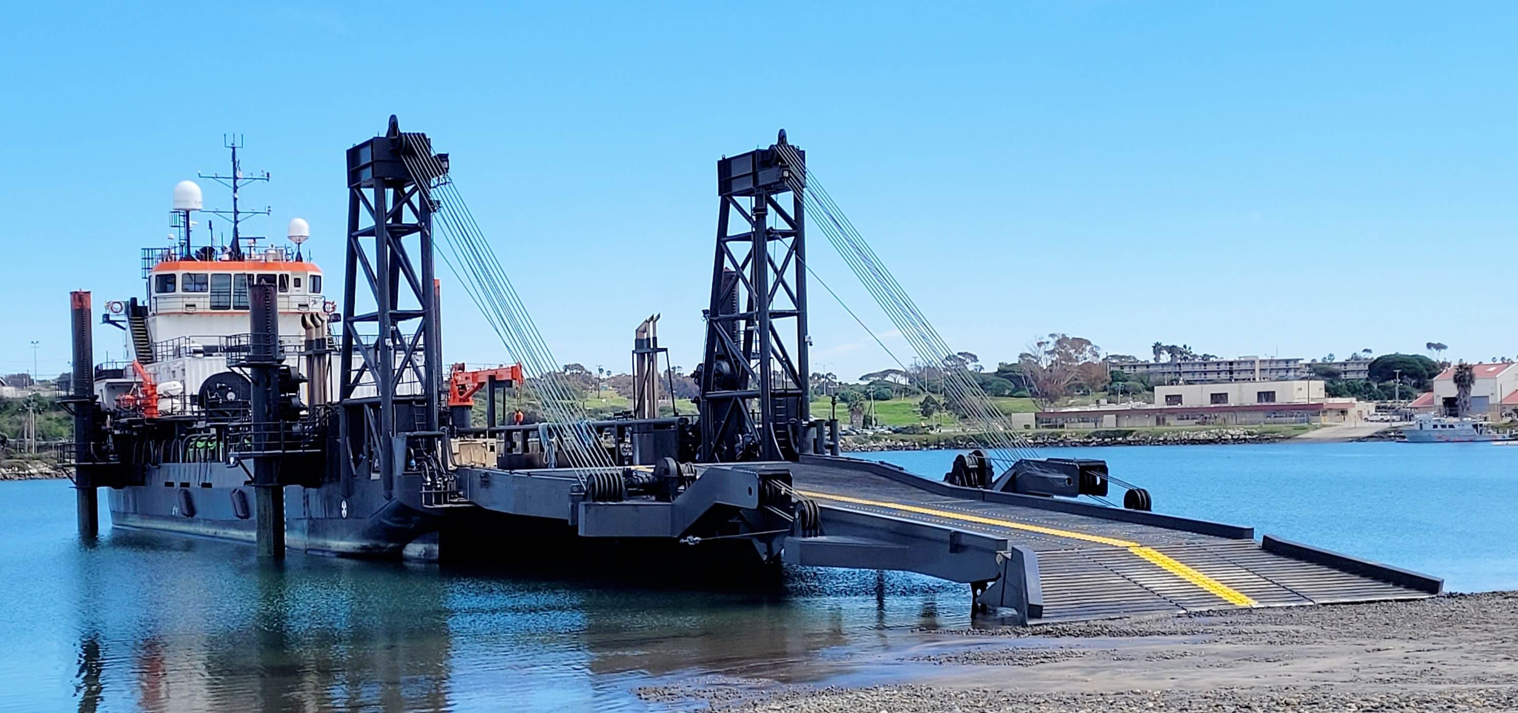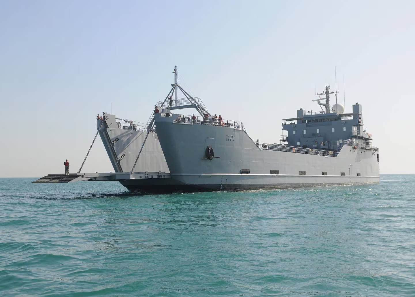 美國陸軍也擁有數量不少用於運輸的船艇,圖為正在與美國海軍船塢登陸艦進行跳板尾門間轉移訓練的美國陸軍“弗蘭克·S·貝松”級後勤支援船USAV SP4“詹姆斯·A·盧克斯”號。