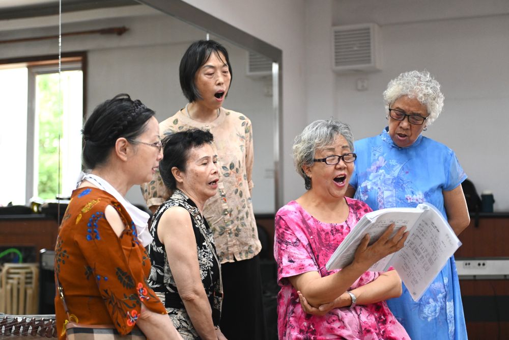 6月19日,長城花園社區居民在社區“才藝堂”製作剪紙。