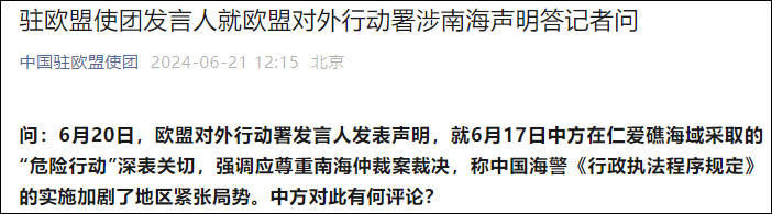 據微信公眾號“中國駐歐盟使團”6月21日消息,駐歐盟使團發言人就歐盟對外行動署涉南海聲明答記者問。