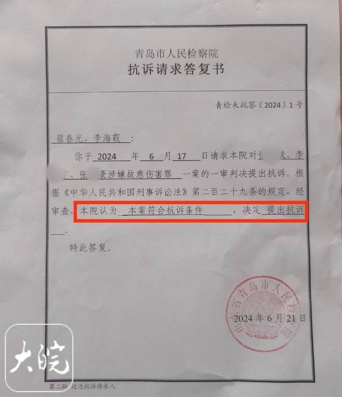 大皖新聞記者21日從答覆書上看到,6月17日,翟春光、李海霞(琦琦之母)請求青島市人民檢察院,對張某斌、李某丁、張某豪涉嫌故意傷害罪一案的一審判決提出抗訴,根據規定,經審查,青島市人民檢察院認為本案符合抗訴條件,決定提出抗訴。