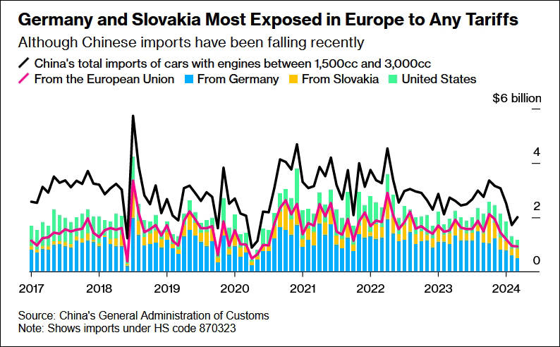 從中國汽車出口量來看,德國和斯洛伐克最容易受任何歐盟潛在關税影響(彭博社)