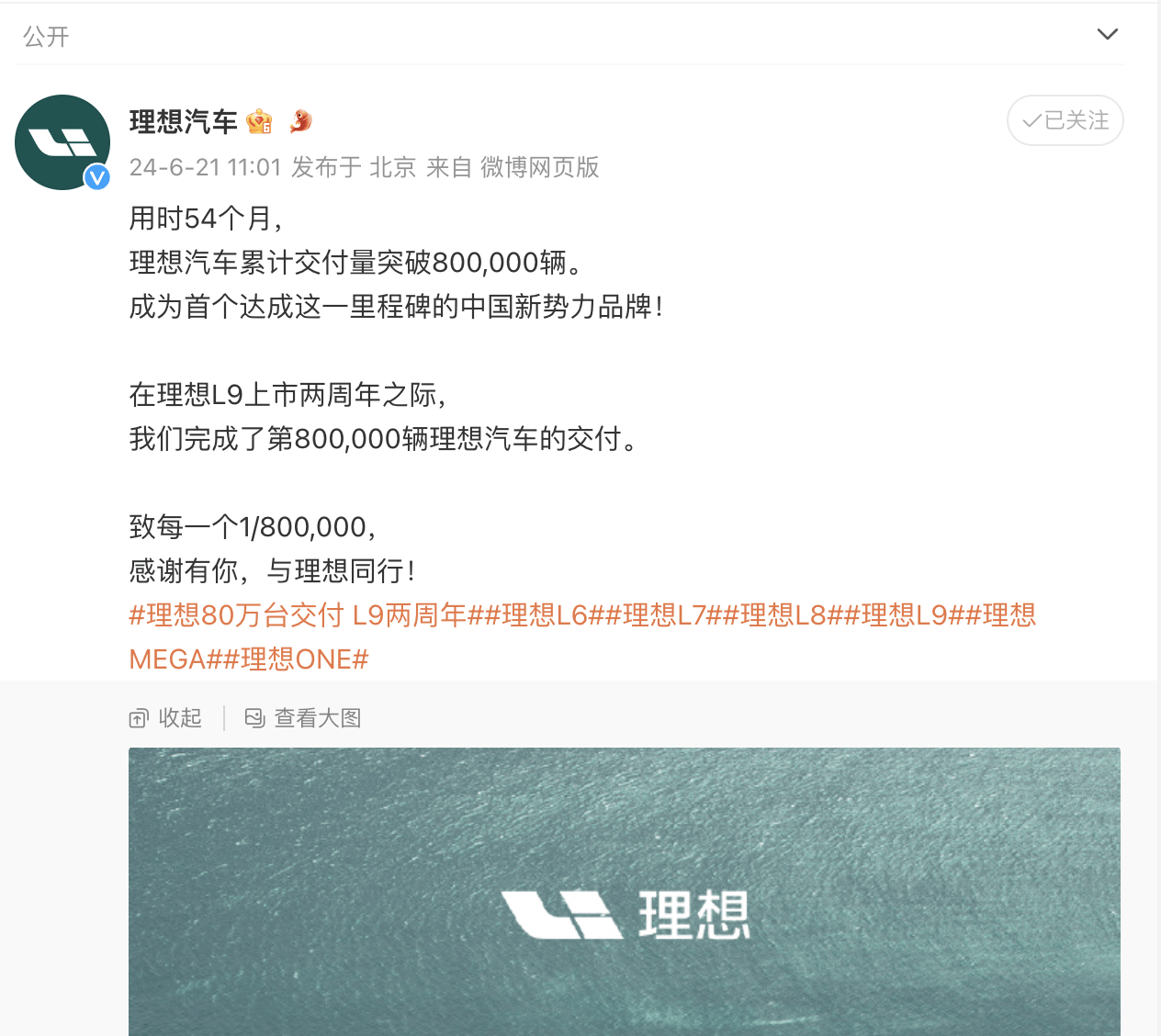 (文/周盛明 編輯/高莘)2024年6月21日,理想汽車官方宣佈,理想汽車累計交付突破 80 萬輛,用時 54 個月,成為首個達成這一里程碑的中國新勢力品牌。理想全系第 80 萬個車主為理想 L9 車主,理想 L9 上市 2 週年,已擁有超過 19 萬車主。