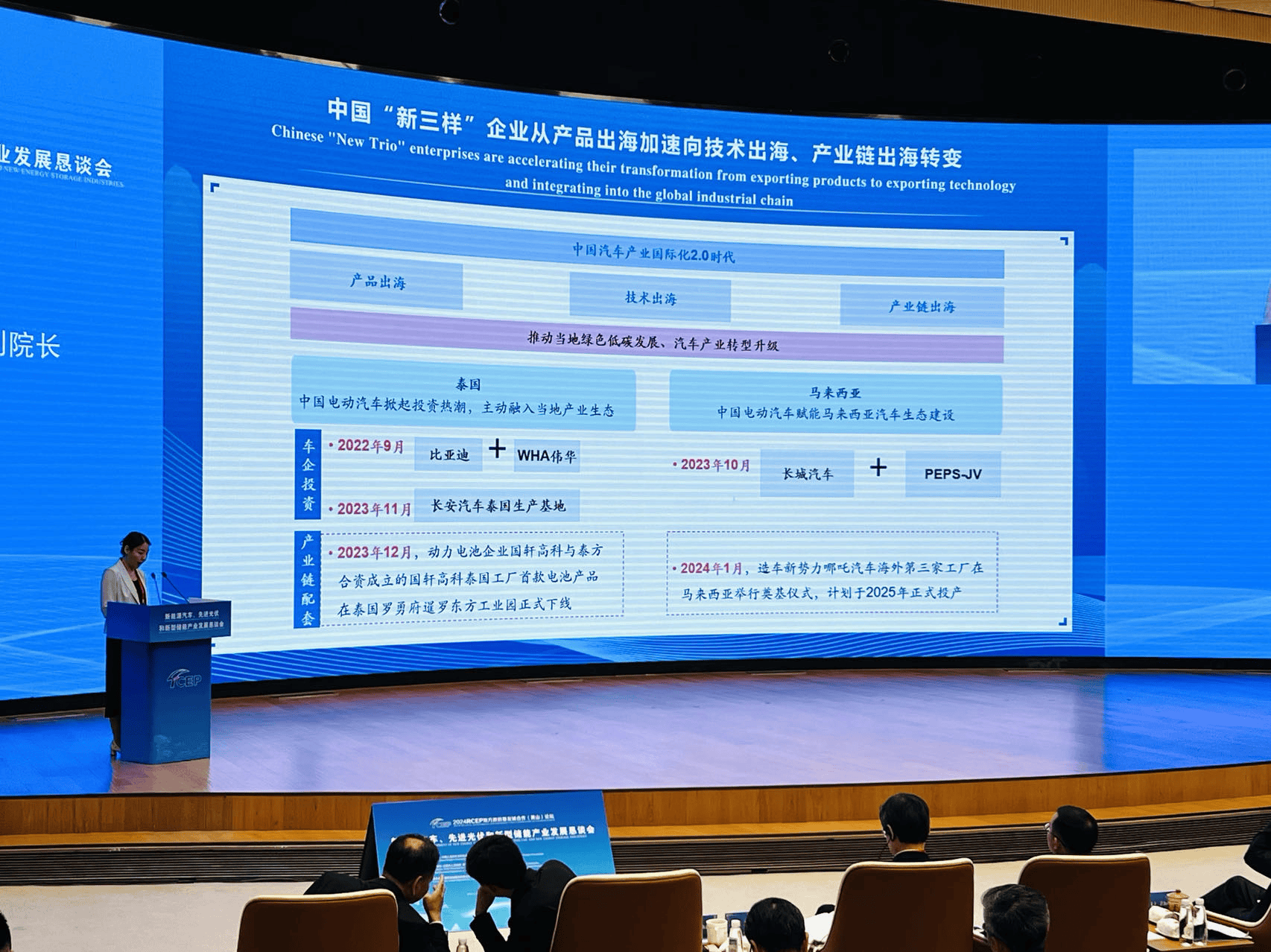 懇談會還舉辦了新能源汽車產業,先進光伏和新型儲能產業兩場對話會,與會代表就如何在RCEP協議框架下進一步推進“新三樣”產業合作開展對話、推介和洽談。