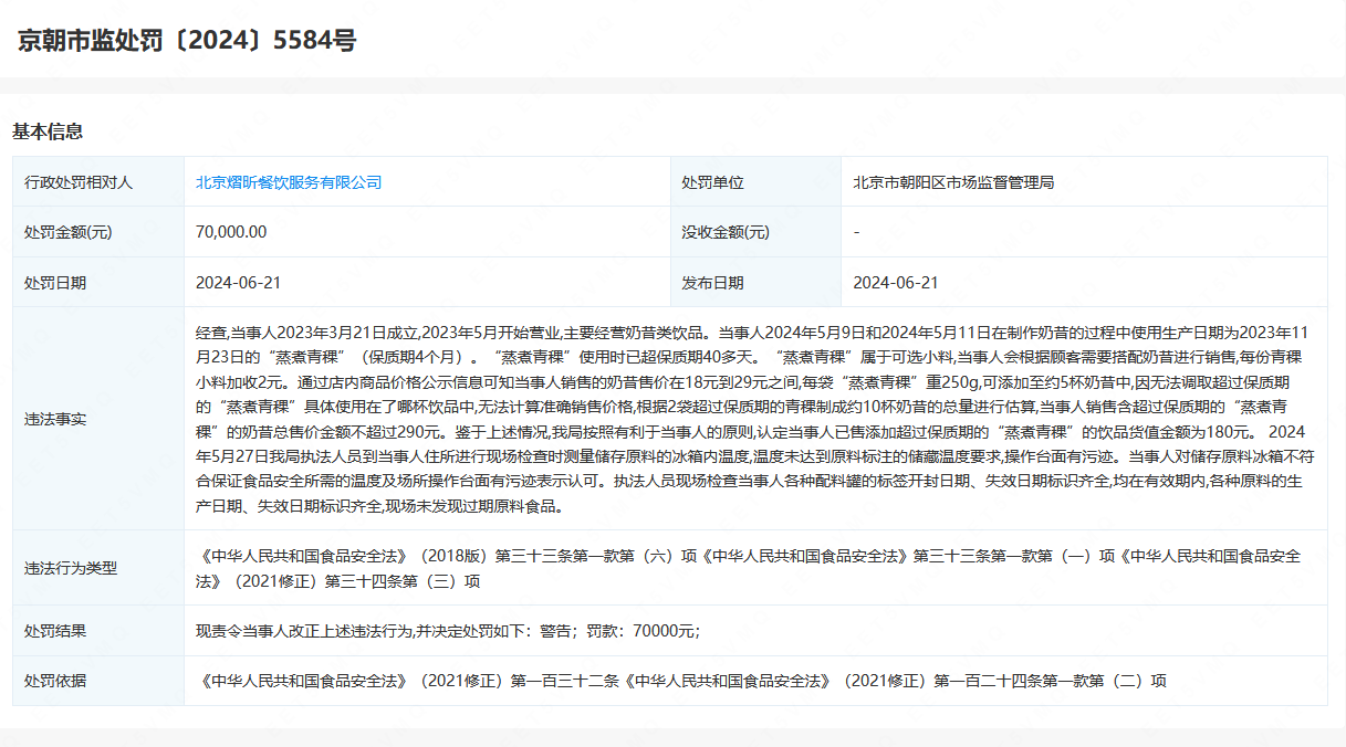 企查查顯示,6月21日,北京熠昕餐飲服務有限公司(茉酸奶伊藤洋華堂店)被北京市朝陽區市場監督管理局罰款7萬元。
