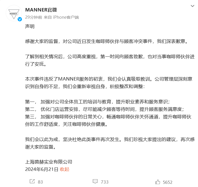 微博@MANNER官微 21日晚發佈聲明回應近期被曝光的多起店員與顧客的衝突事件並致歉。聲明中寫道,Maneer後續將加強員工培訓, 優化門店運營安排,減少顧客等待時間並提高咖啡師的工作舒適度。