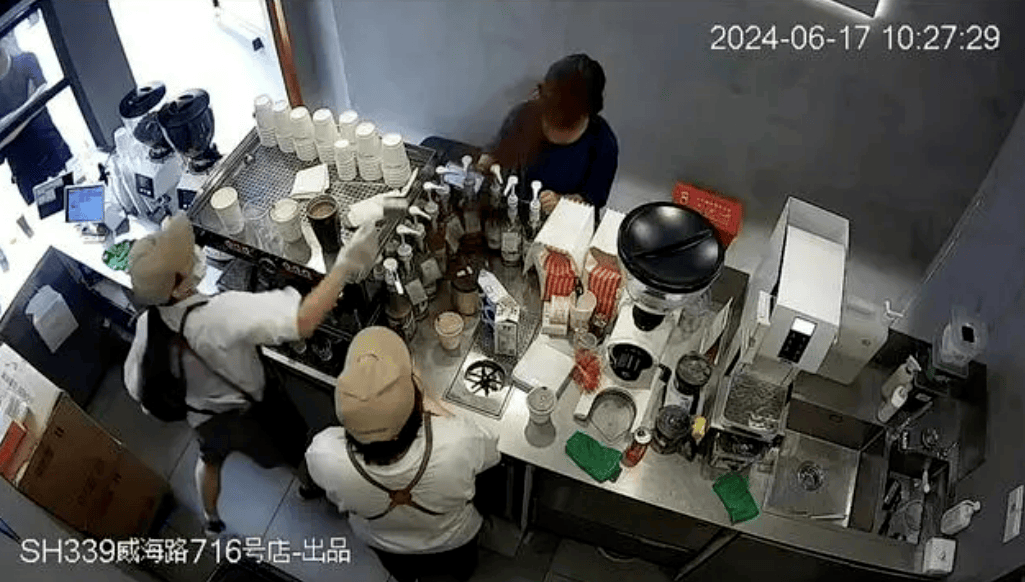 而6月21日,又有網友在社交平台發佈了一段監控視頻並稱其為Manner咖啡上海海夢一方店內的監控視頻。視頻內容顯示,2024年5月22日14時許,一家咖啡店內一名男店員和一名黑衣男子發生爭執。很快,雙方爭吵變得十分激烈,黑衣男子走進製作區域,與店員發生肢體衝突。