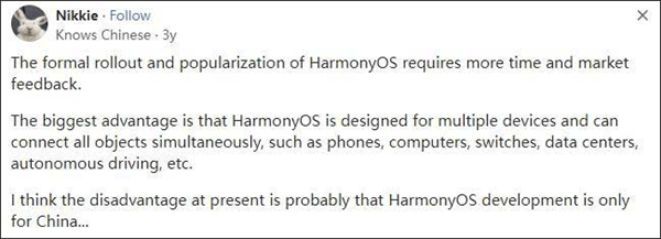 海外的某開發者三年前就已意識到鴻蒙的一大優勢:一個系統貫穿不同終端(@quora)
