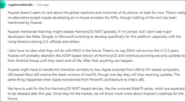 海外的某開發者也在社交媒體上指出(如下圖),華為的這個打法和蘋果差不多,當初蘋果PC也是逐漸從x86架構中剝離出來,時至今日,x86架構下的蘋果操作系統還能收到macOS的更新信息,直到有一天macOS完全終止向x86提供更新信息服務。