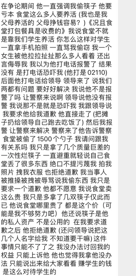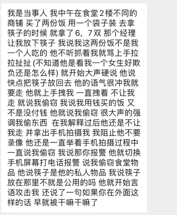 女生買兩份飯拿6雙筷子被怒斥盜竊?校方回應