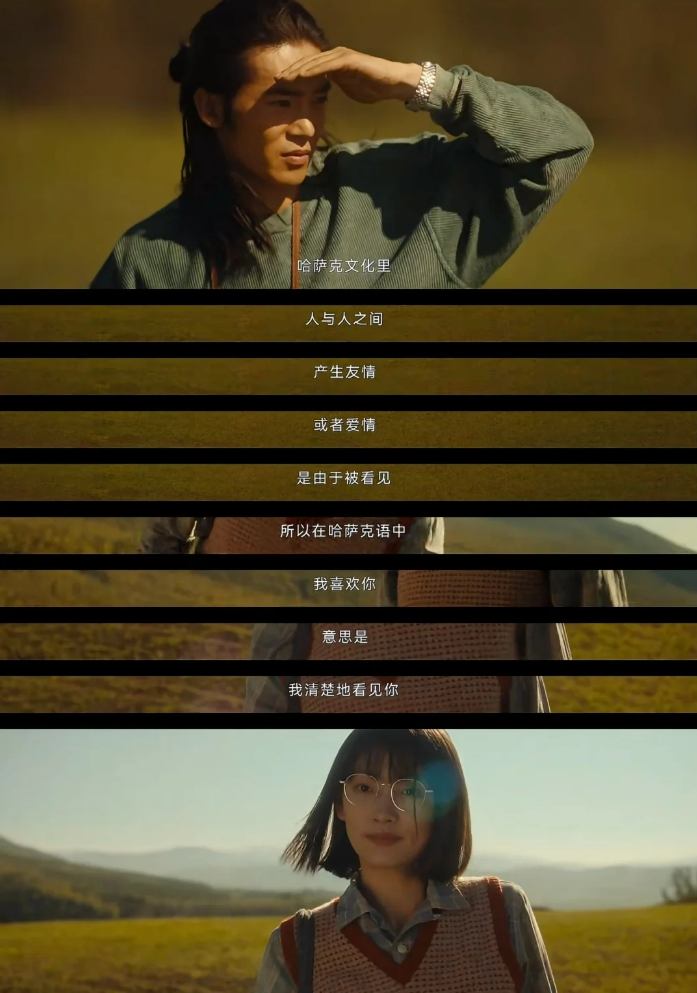 巧合的是,劇中,與哈薩克牧民相戀的青年女作家李文秀也旁白説:“在哈薩克族語裏的‘我喜歡你’直譯成漢語為‘我清楚地看見你’。”