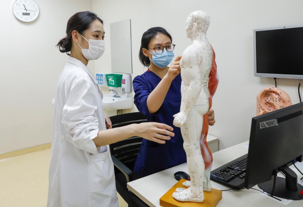 醫護人員在查看針灸經絡穴位人體模型(資料圖/新華社)