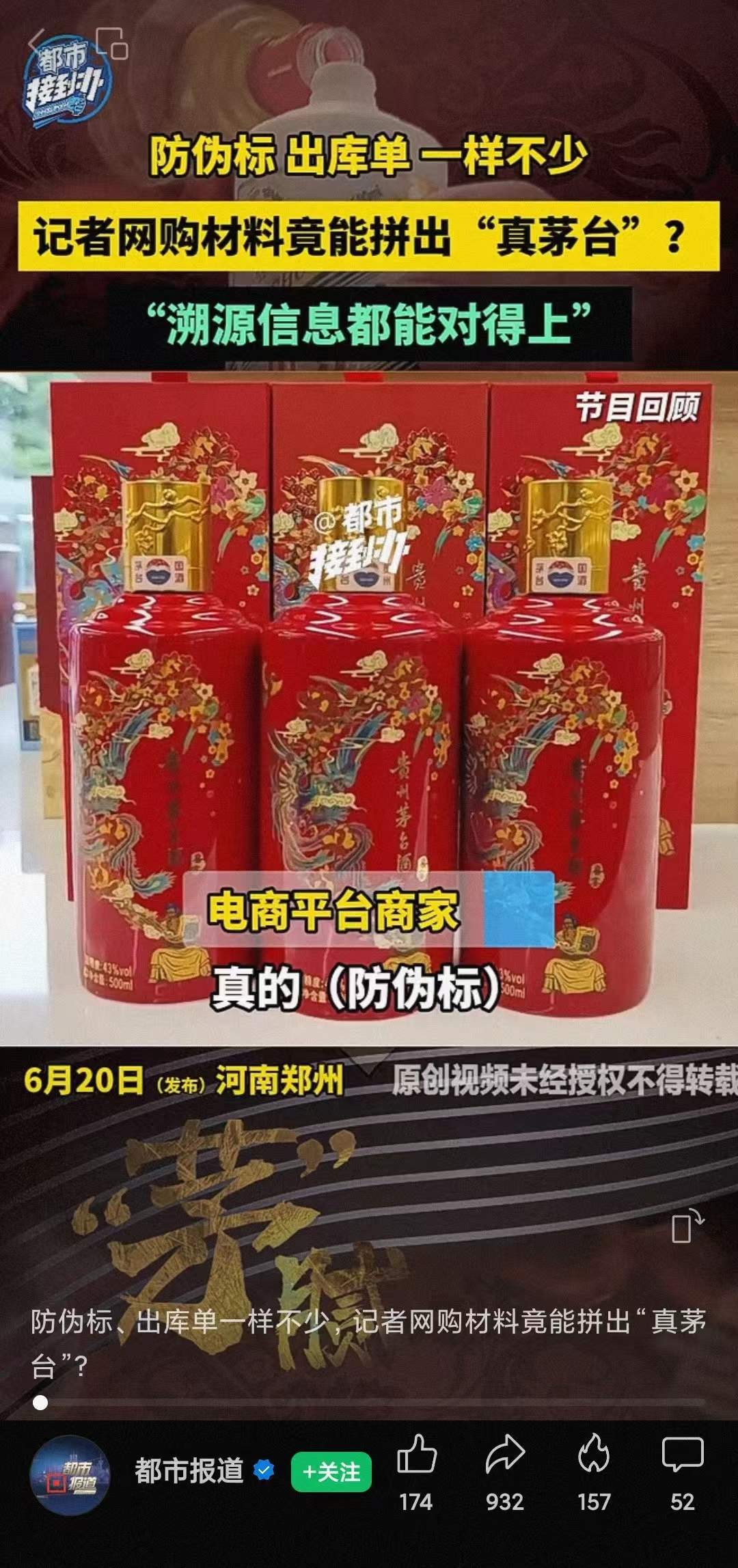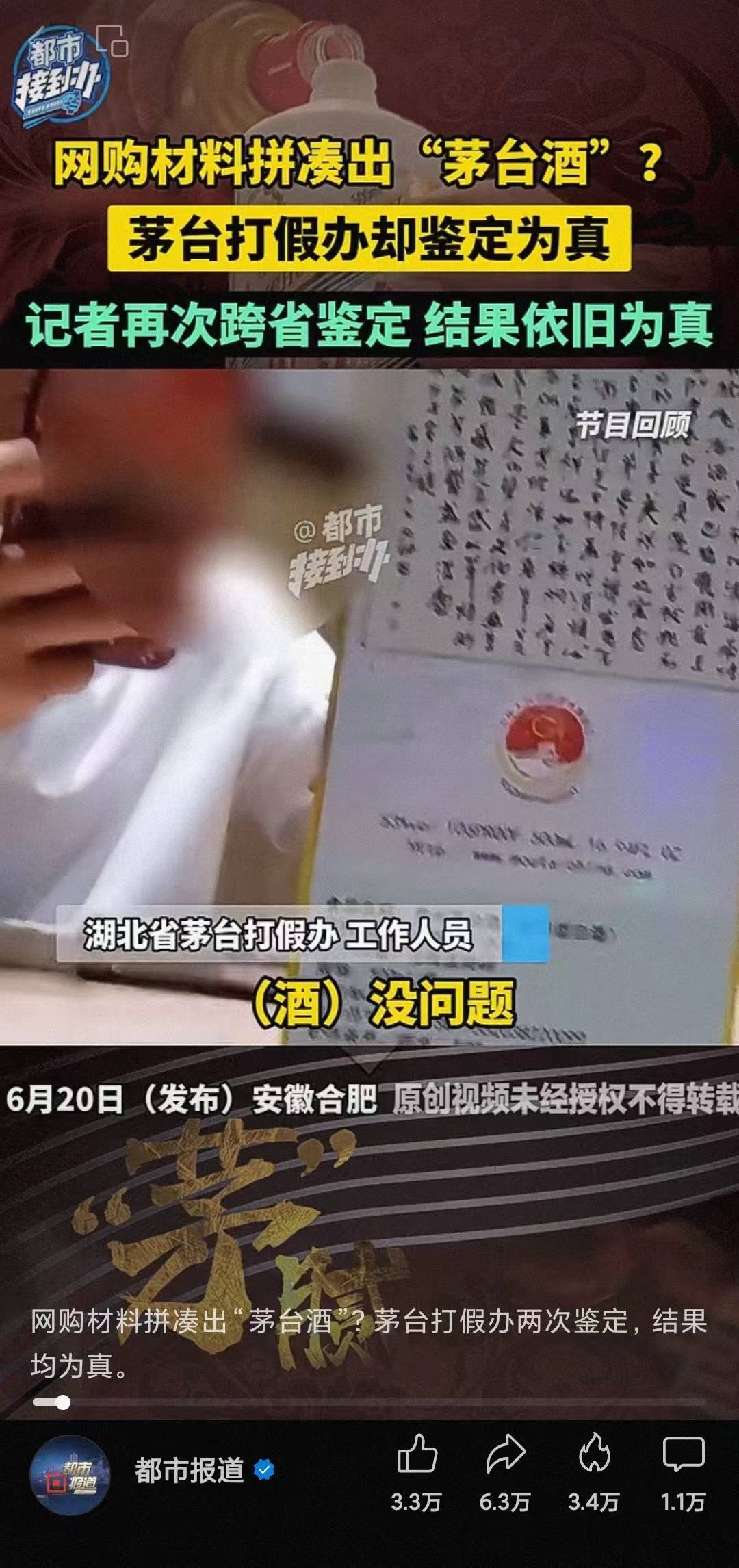 6月20日,據河南廣播電視台都市報道視頻號,一套記者自行拼湊的兔年茅台假酒,使用了在電商平台湊夠的一整套茅台包裝。該酒被武漢的茅台公司打假辦工作人員鑑定為真。