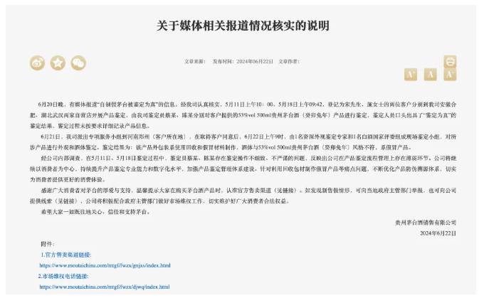 6月21日,公司派出專項服務小組到河南鄭州(客户所在地),在取得客户同意後,6月22日上午9時,由1名資深外觀鑑定專家和1名白酒國家評委組成現場鑑定小組,對所涉產品進行外觀和酒體鑑定。鑑定結果為:該產品外包裝系使用回收和假冒材料製作,酒體與53%vol 500ml貴州茅台酒(癸卯兔年)風格不符,系假冒產品。