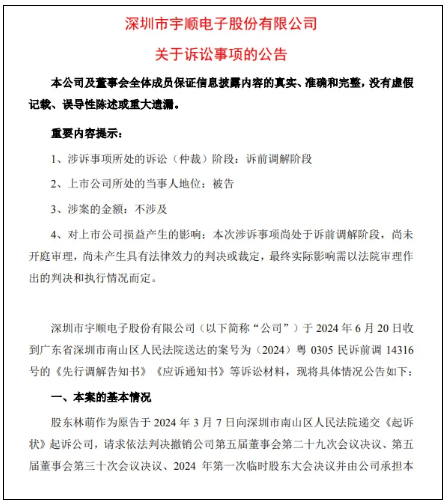 半年後,事件迎來新進展。據ST宇順(002289.SZ)6月21日披露,公司於近日收到廣東省深圳市南山區人民法院送達的《先行調解告知書》《應訴通知書》等訴訟材料。