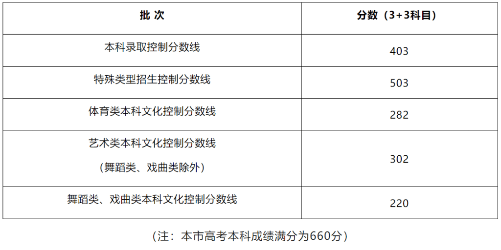 **答:**在高考成績開通查詢的同時,我們公佈了本科各批次錄取控制分數線,本科錄取控制分數線為403分;特殊類型招生控制分數線為503分;藝術類本科文化控制分數線為302分,其中舞蹈類、戲曲類本科文化控制分數線220分;體育類本科文化控制分數線為282分。考生可以結合控制分數線以及本人“3+3”高考成績,判斷自己能否參與本科各批次的志願填報。
