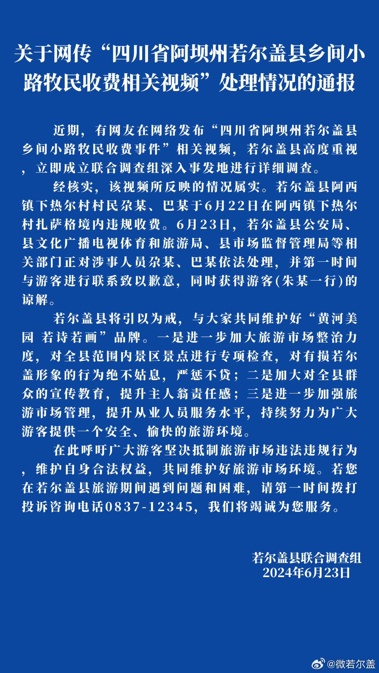 經核實,該視頻所反映的情況屬實。若爾蓋縣阿西鎮下熱爾村村民尕某、巴某於6月22日在阿西鎮下熱爾村扎薩格境內違規收費。6月23日,若爾蓋縣公安局、縣文化廣播電視體育和旅遊局、縣市場監督管理局等相關部門正對涉事人員尕某、巴某依法處理,並第一時間與遊客進行聯繫致以歉意,同時獲得遊客(朱某一行)的諒解。