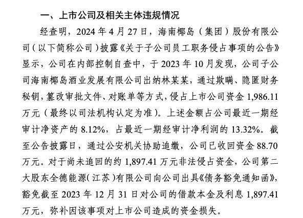 據悉,海南椰島於2023年10月發現,海南椰島子公司海南椰島酒業發展有限公司出納人員非法侵佔公司資金1986.11 萬元。目前通過公安機關協助追繳,已收回88.7萬元,約1897.41萬元資金尚未收回。