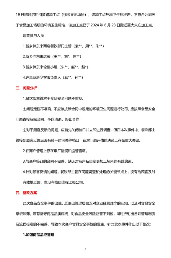 ①新鄉餐飲部第一主管(周**)和品控員(李**)在工作中存在嚴重失職,對本事件負直接責任,依據公司制度決定對以上兩位人員予以辭退,其他班長以上管理層全部予以免職;