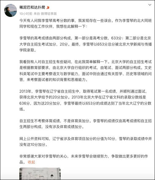 6月26日,一位自稱李雪琴北大同班同學的網友曬出入學成績單為她發聲,稱李雪琴高考成績中的20分自主招生考試加分和體育特長無關。
