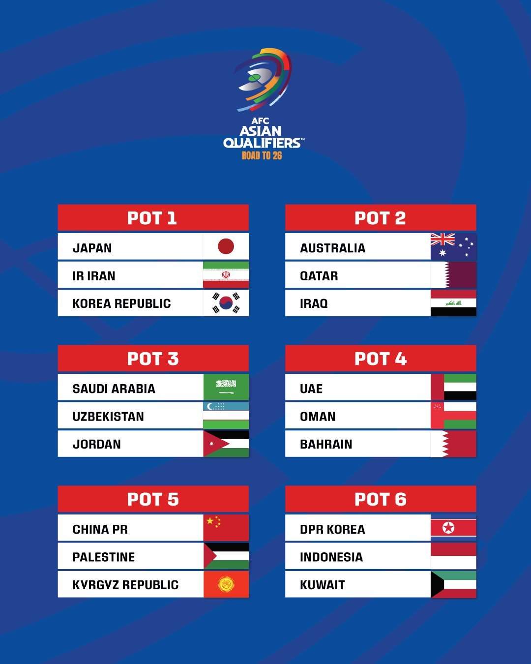 此外,朝鮮、吉爾吉斯斯坦、阿聯酋、烏茲別克斯坦、卡塔爾、伊朗被分入A組;科威特、巴勒斯坦、阿曼、約旦、伊拉克、韓國被分入B組。