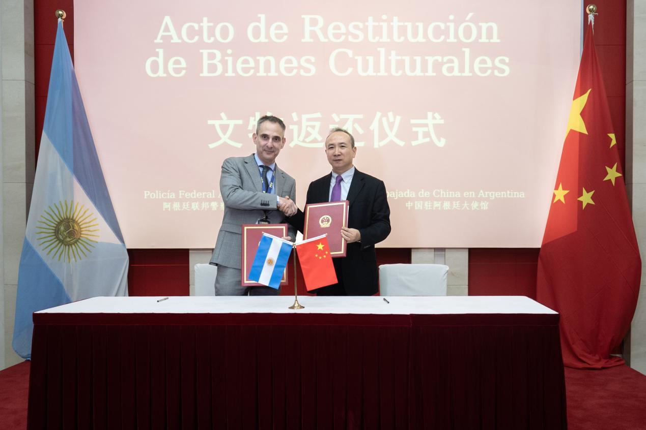據中國駐阿根廷大使館網站消息,6月27日,阿根廷向中國返回文物藝術品移交儀式在中國駐阿根廷使館舉行。王衞大使和阿外交部、文化國秘處、聯邦警察總局、地方法院等官員出席。
