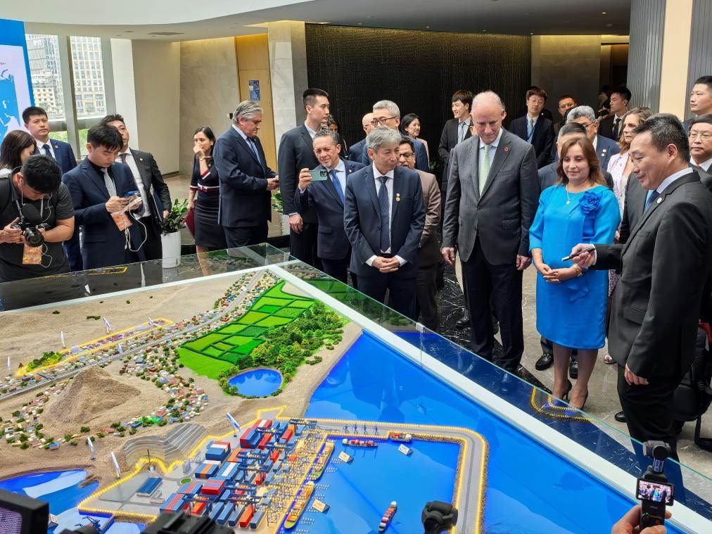 6月27日,秘魯總統博魯阿爾特在中遠海運集團錢凱港項目沙盤前聽取介紹。新華社記者吳宇 攝