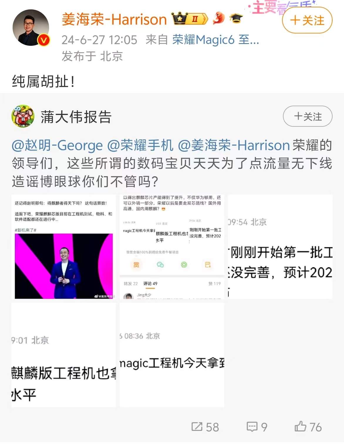 針對這些傳聞,榮耀CMO(首席營銷官)姜海榮6月27日在微博轉發並配文稱:純屬胡扯。