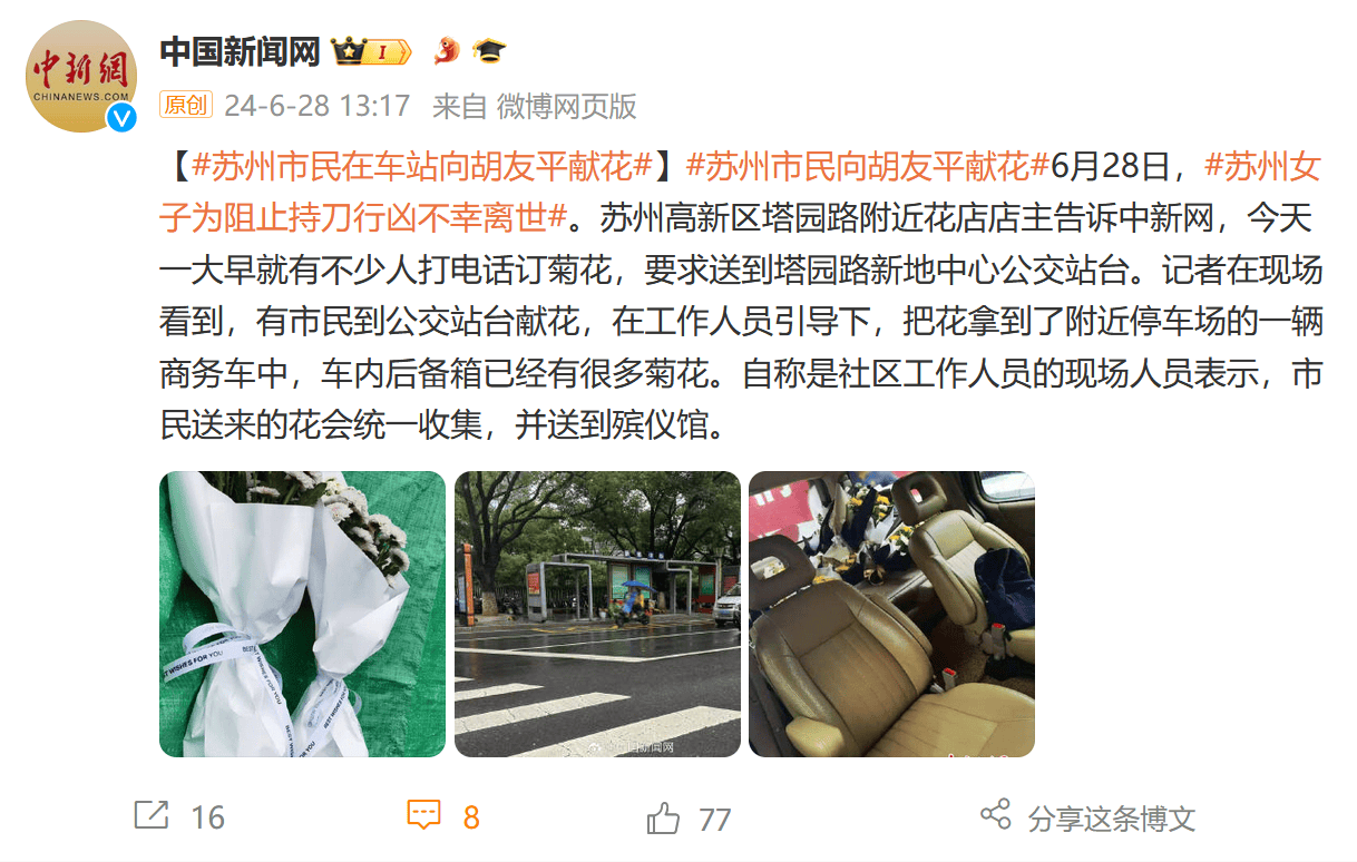 6月28日,有消息稱蘇州女子為阻止持刀行兇不幸離世。