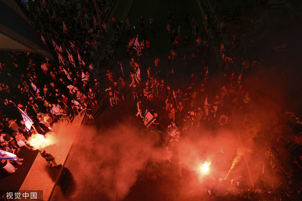 當地時間6月29日,以色列特拉維夫,抗議者舉行集會要求結束衝突並提前選舉(視覺中國)