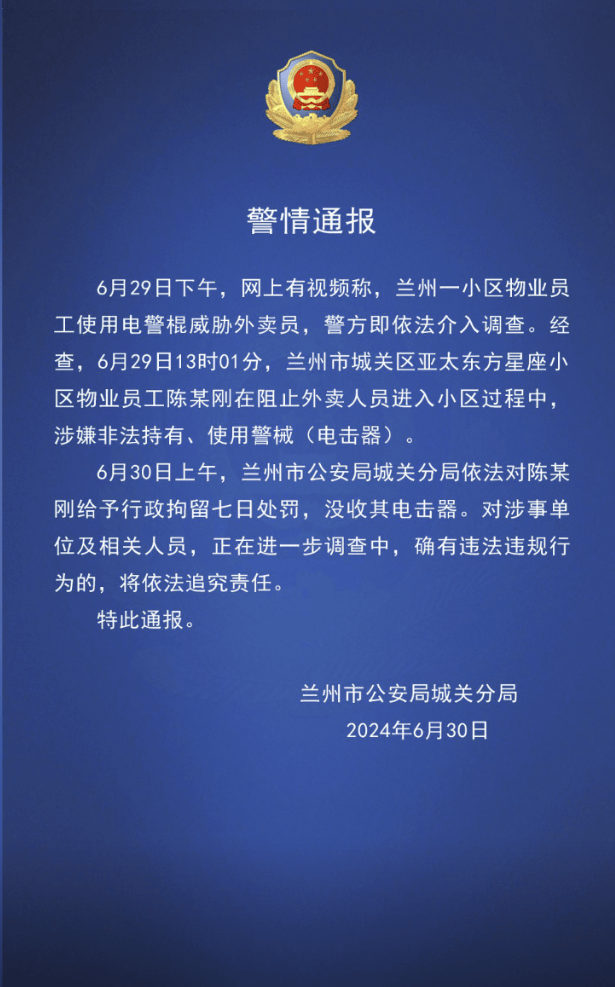 6月29日下午,網上有視頻稱,蘭州一小區物業員工使用電警棍威脅外賣員,警方即依法介入調查。經查,6月29日13時01分,蘭州市城關區亞太東方星座小區物業員工陳某剛在阻止外賣人員進入小區過程中,涉嫌非法持有、使用警械(電擊器)。