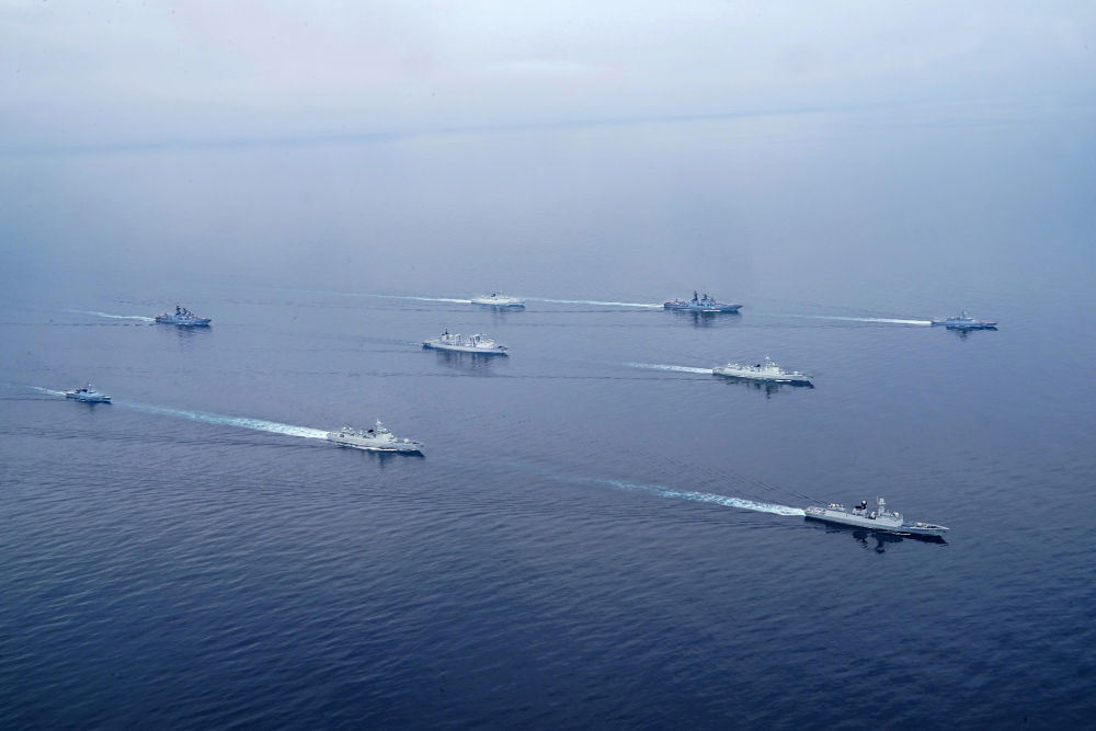 2023年7月20日,在日本海某海域進行的“北部·聯合-2023”演習中,中俄參演艦艇編隊開展海空護航演練。 新華社發(劉丹 攝)