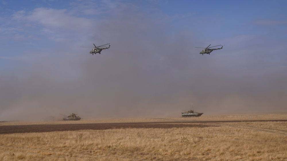 2021年9月23日,在俄羅斯奧倫堡州東古茲靶場舉行的“和平使命-2021”上海合作組織聯合反恐軍事演習實兵實彈演習中,多國聯合部隊進行陸空協同作戰。 新華社記者 梅世雄 攝