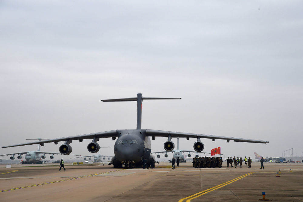 空軍出動3型11架運輸機多地同步向武漢空運醫療隊員(2020年2月13日攝)。 新華社記者 黎雲 攝