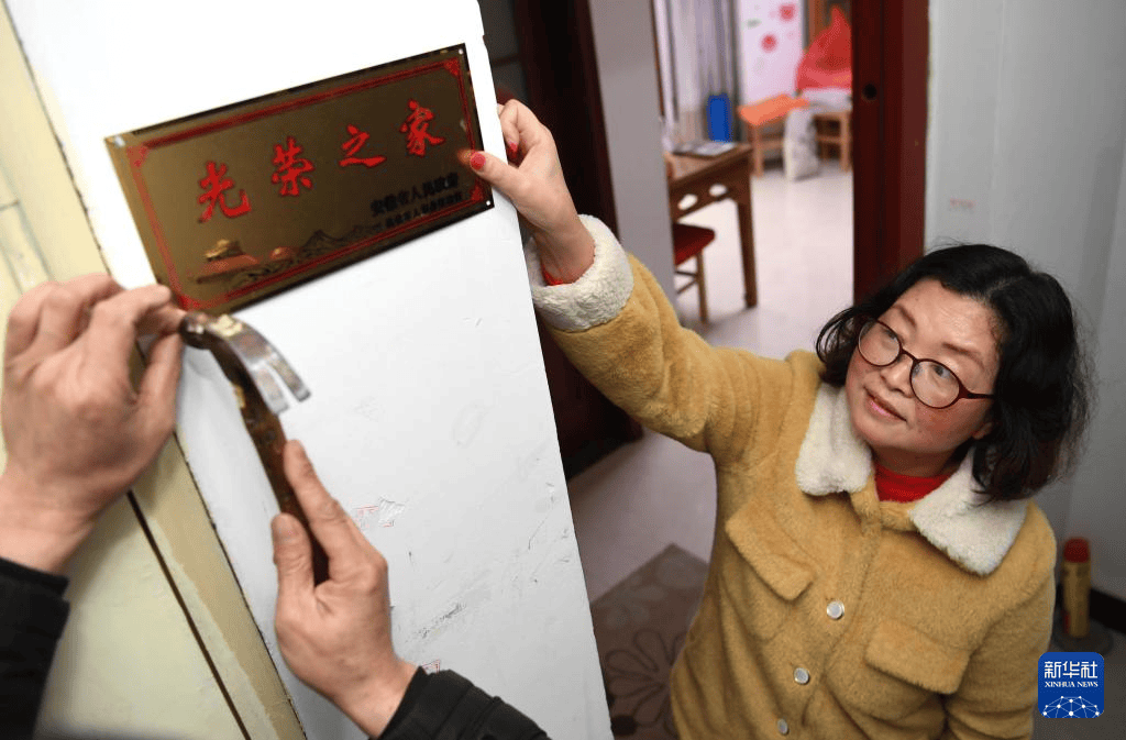 合肥市包河區常青街道工作人員在居民魏松梅(右)家門口懸掛“光榮之家”牌(2019年1月14日攝)。 新華社記者 劉軍喜 攝