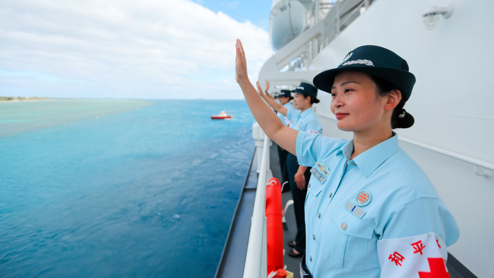 中國海軍“和平方舟”號醫院船結束訪問湯加時,任務官兵中的文職人員向歡送人羣揮手告別(2023年8月4日攝)。 新華社發(徐巍 攝)