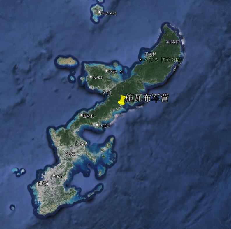 駐沖繩美國海軍陸戰隊施瓦布軍營大門(上圖)及位置示意(下圖)社交媒體