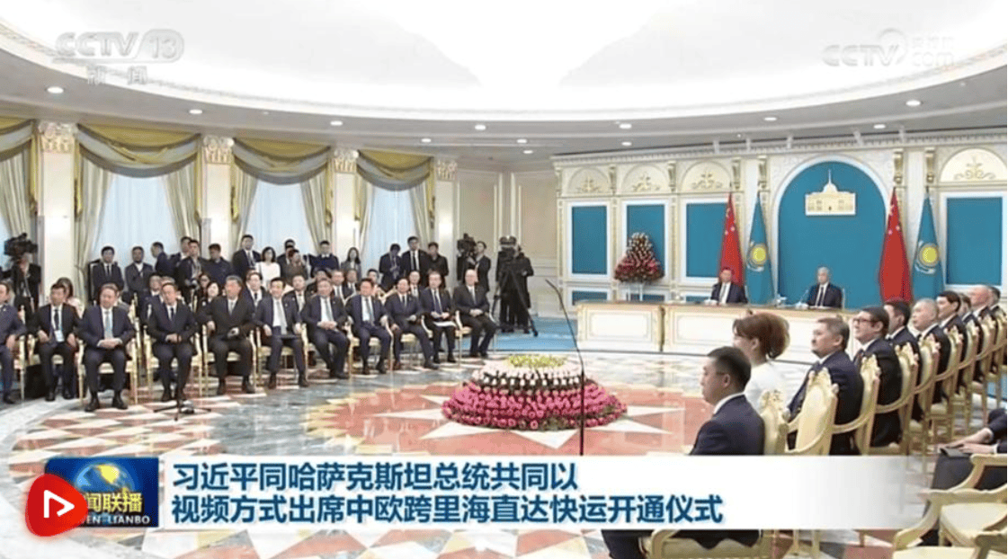當地時間7月3日中午,國家主席習近平同哈薩克斯坦總統託卡耶夫在阿斯塔納總統府以視頻方式共同出席中歐跨裏海直達快運開通儀式。