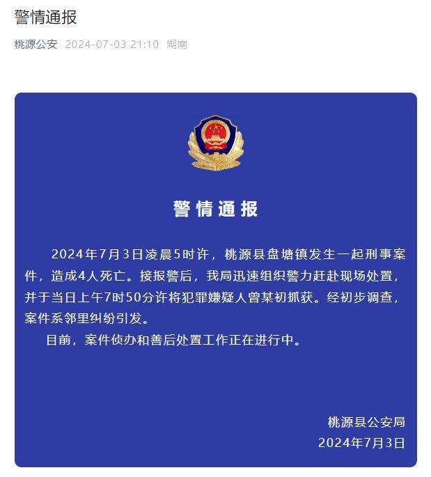 7月3日,湖南桃源縣公安局公眾號發佈警情通報:3日凌晨5時許,桃源縣盤塘鎮發生一起刑事案件,造成4人死亡。接報警後,警方迅速組織警力趕赴現場處置,並於當日上午7時50分許將犯罪嫌疑人曾某初抓獲。經初步調查,案件系鄰里糾紛引發。目前,案件偵辦和善後處置工作正在進行中。