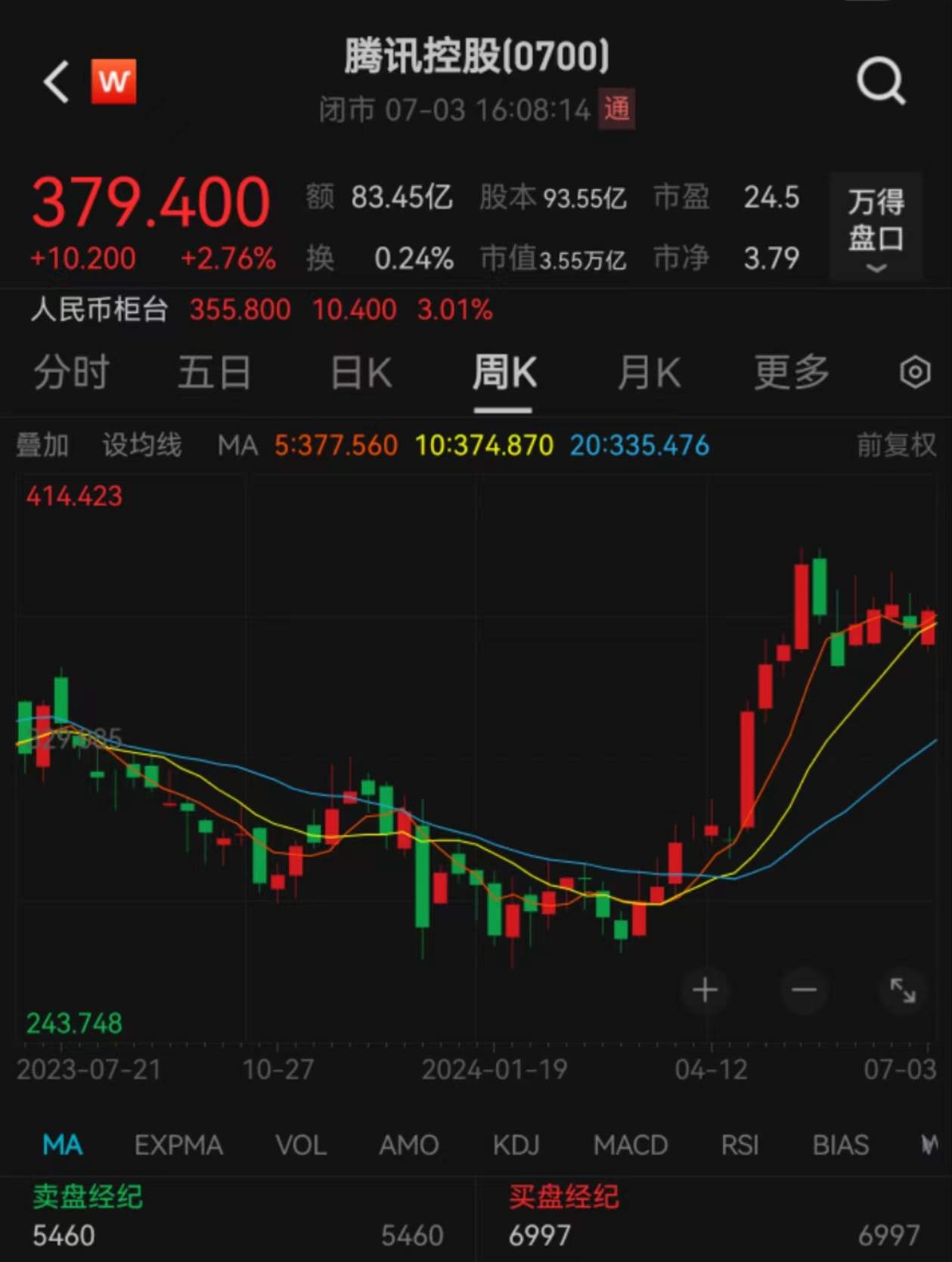 7月3日港股收盤,騰訊報每股379.4港元,總市值3.55萬億港元。