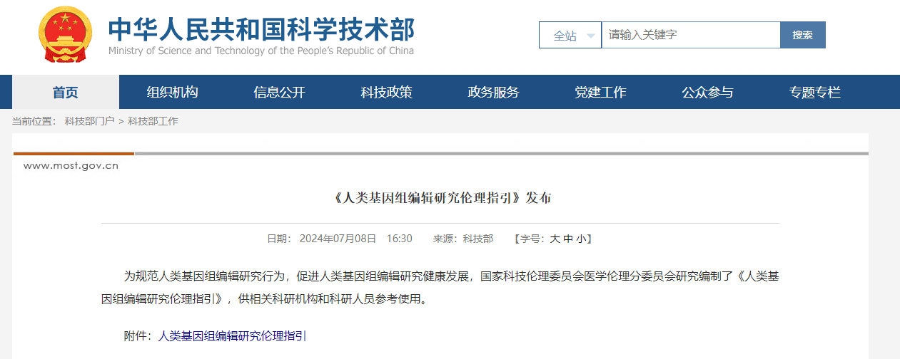 科技部網站7月8日消息,為規範人類基因組編輯研究行為,促進人類基因組編輯研究健康發展,國家科技倫理委員會醫學倫理分委員會研究編制了《人類基因組編輯研究倫理指引》,供相關科研機構和科研人員參考使用。