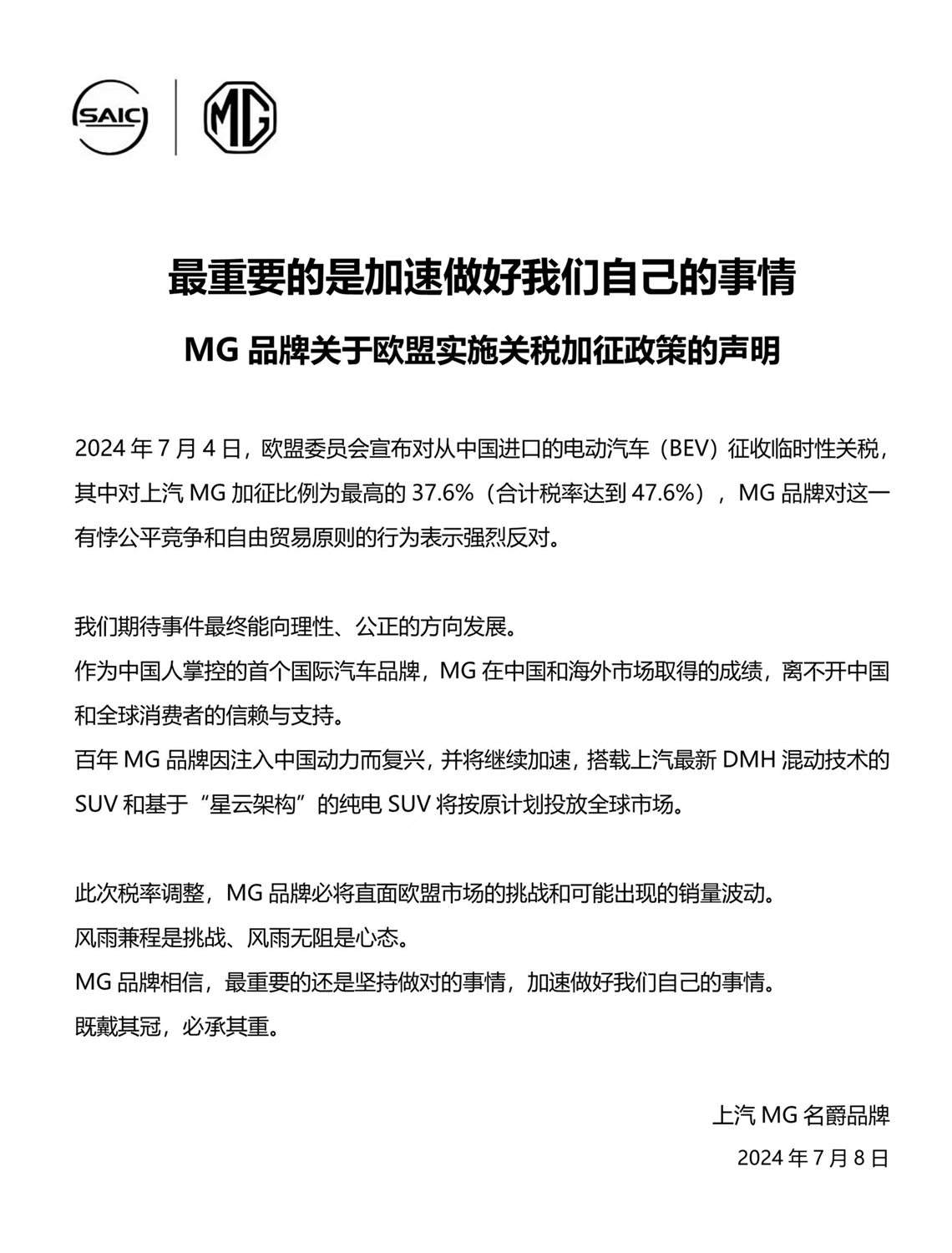 (文/潘昱辰 編輯/高莘)7月4日,歐盟委員會宣佈對從中國進口的電動汽車徵收臨時性關税,其中對上汽MG加徵税率最高的37.6%(合計税率達到47.6%)。對此,上汽MG名爵品牌於7月8日回應稱,對這一有悖公平競爭和自由貿易原則的行為表示強烈反對,期待事件最終能向理性、公正的方向發展。