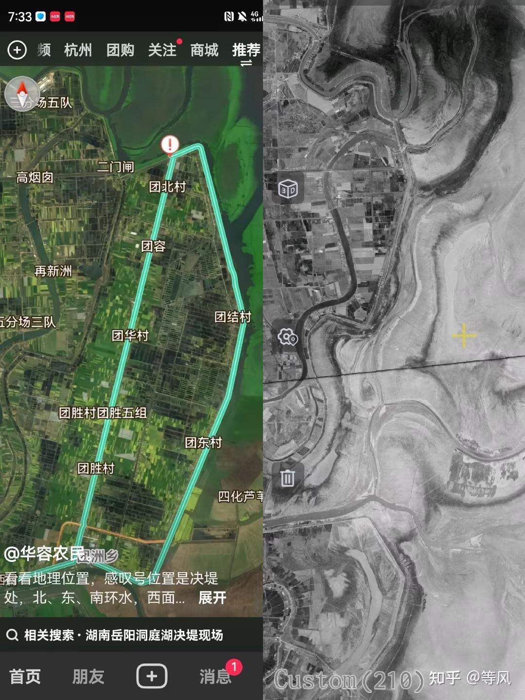 然後我們看下圖(紅色為二級和三級堤防和一些圍堤)。團洲鄉和良心堡鎮就有額外的圍堤圍起來,這是2022年才修好的蓄洪垸工程,不知道能不能保住這倆鄉鎮,不過看情況可能保得住,但是團結村和團新村沒有額外堤防肯定保不住。另外,可能水會越過第二級進入七星湖村、向陽村一帶,5號晚上最重要的就是守住二級堤防,防止水進入七星湖村。而目前西北那個錢糧湖鎮是肯定要保的,它是一個大鎮。