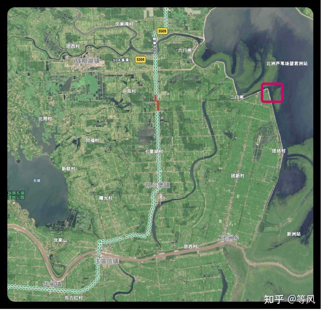 首先是決堤位置,是下圖方框位置。這是位於岳陽市華容縣團結村北部的洞庭湖大堤,決堤附近沒有明顯的城市,遠離岳陽市和岳陽縣,這相對來講是個好消息(但是仍然有一些小鎮)。